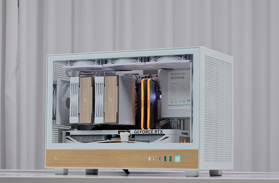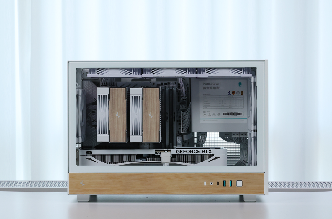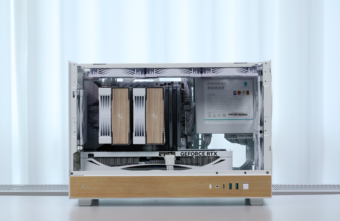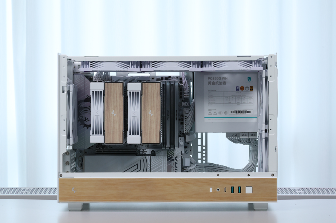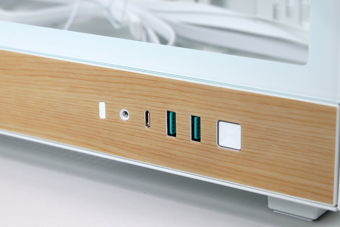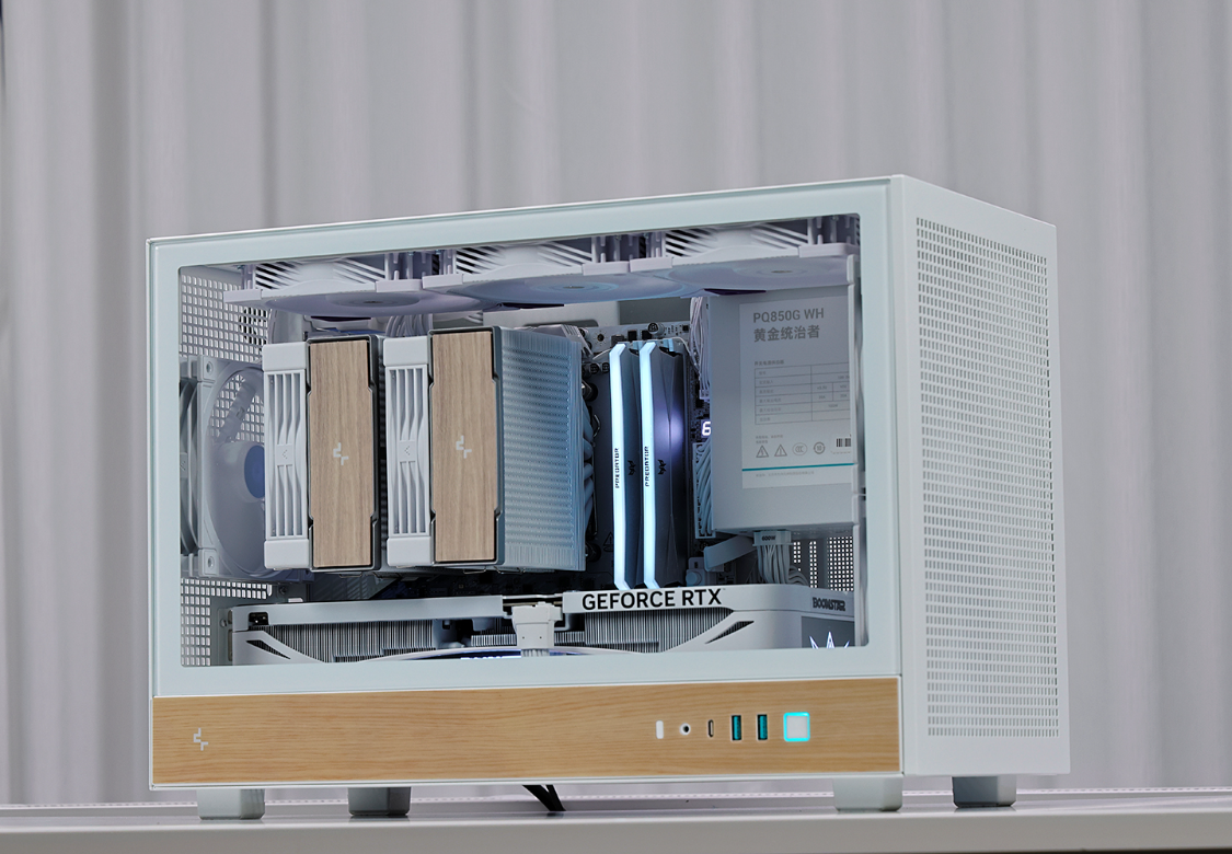 机箱I/O面板和风冷顶部的木纹贴片元素,跟其他白色硬件搭配相得益彰,不仅不突兀,还能更好地融入整个家居环境。