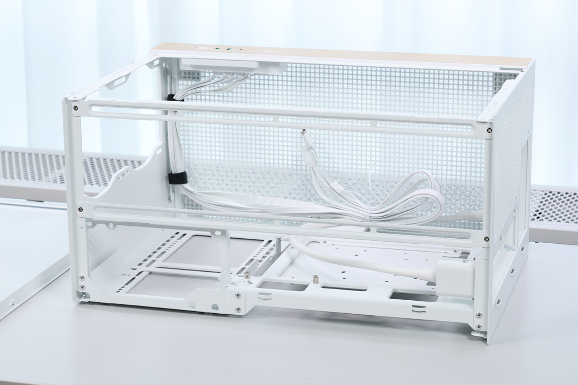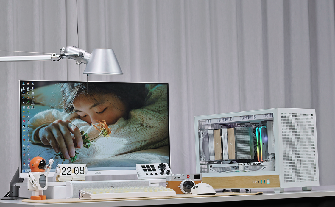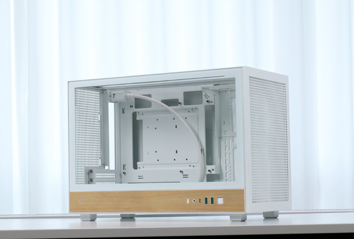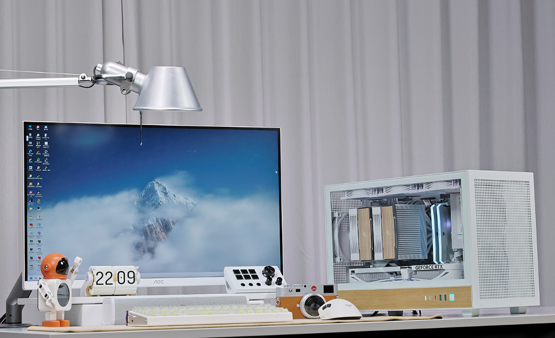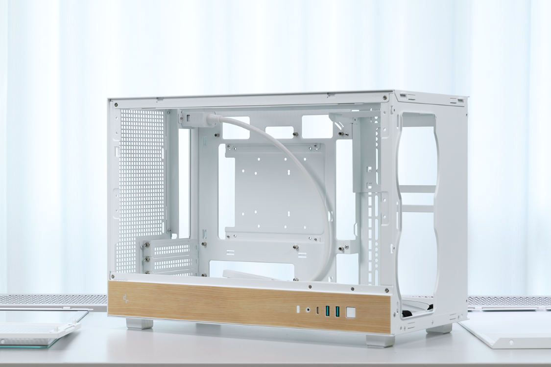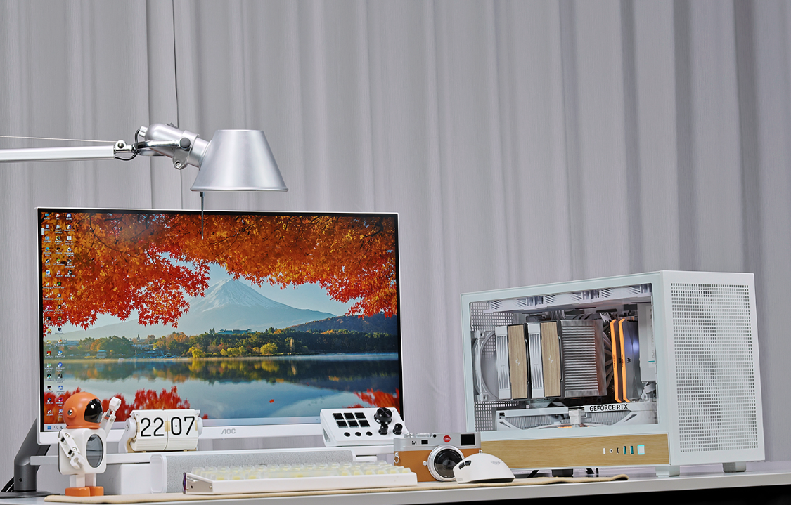 机箱I/O面板和风冷顶部的木纹贴片元素,跟其他白色硬件搭配相得益彰,不仅不突兀,还能更好地融入整个家居环境。