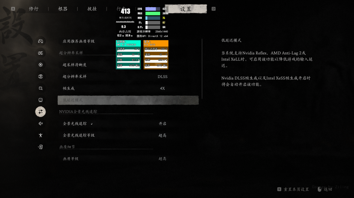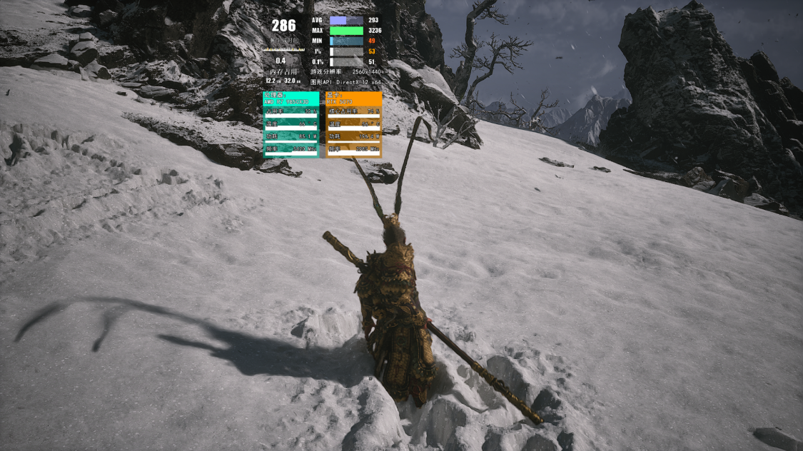 《黑神话·悟空》游戏体验,2K分辨率,超高画质,超高光追,开启DLSS 4.0,并将超采样清晰度设为50,在龟背场景中,游戏帧数为280FPS左右,关闭DLSS,并将超采样清晰度设为100,游戏帧数为90FPS左右。