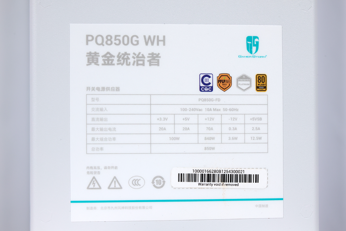 电源采用高规格日系主电容,并通过了严苛的80PLUS金牌认证和Cybenetics白金牌认证,AC230V典型负载(50%)下,转化效率超过90%,节能更省电。电源总功率为850W,其中,+12v最大输出电流为70A,最大组合功率840W,+5V与+3.3V最大输出电流均为20A,联合最大输出功率为100W;同时,电源提供了过流、过压、欠压、抗浪涌等多重保护机制,还有10年的超长质保保障。