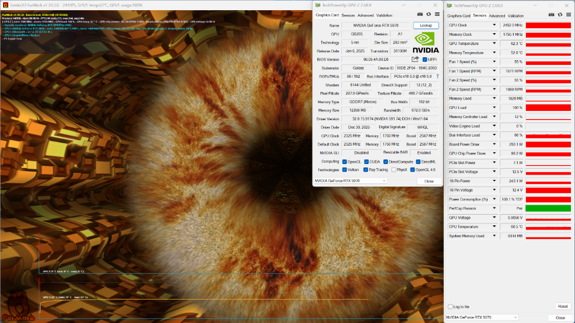 FurMark烤机测试,烤机15Min+,显卡温度最高62.3°左右,显卡功耗250W;