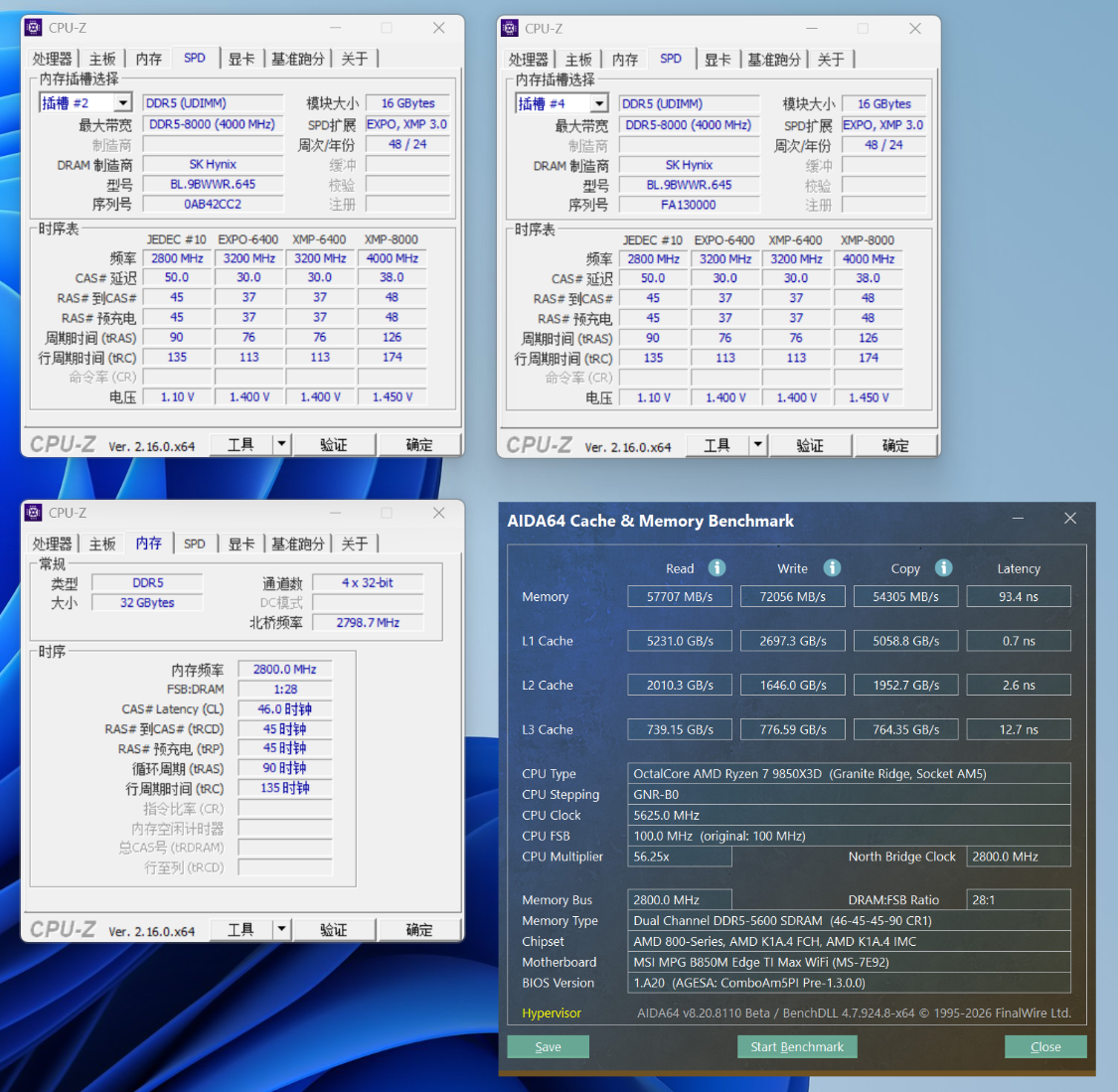 内存默认设置下,读取速度为57707 MB/s,写入速度为72056 MB/s,复制速度为54305 MB/s,延时为93.4 ns