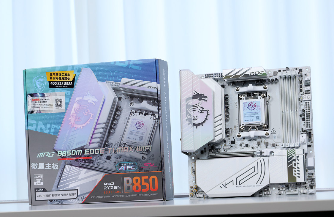 微星MPG B850M EDGE TI MAX WIFI主板。主板延续了刀锋钛系列的设计风格,但是将白进行得更加彻底。主板采用8层服务器级白色PCB/2oz加厚铜设计,电气性能有保障。PCB表面有大面积银白色金属散热装甲,而且视觉层次感非常丰富。供电散热装甲上有支持ARGB的镜面龙魂标志,上面还覆盖了一层半透明的磨砂面板,两处MPG标识也做了半镜面半磨砂的设计,辨识度拉满。