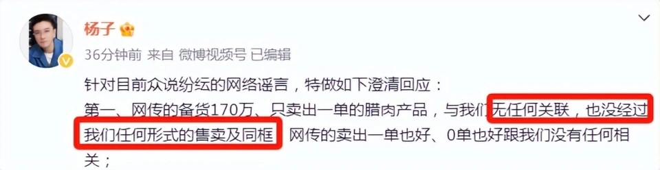 针对这一传闻,杨子在微博上发布了一段视频进行澄清。他表示自己不认识也没有接触过两家招商公司,更没有收取任何招商费用。他还指出,网络上流传的关于他收取招商费的消息没有任何事实依据,完全是谣言。