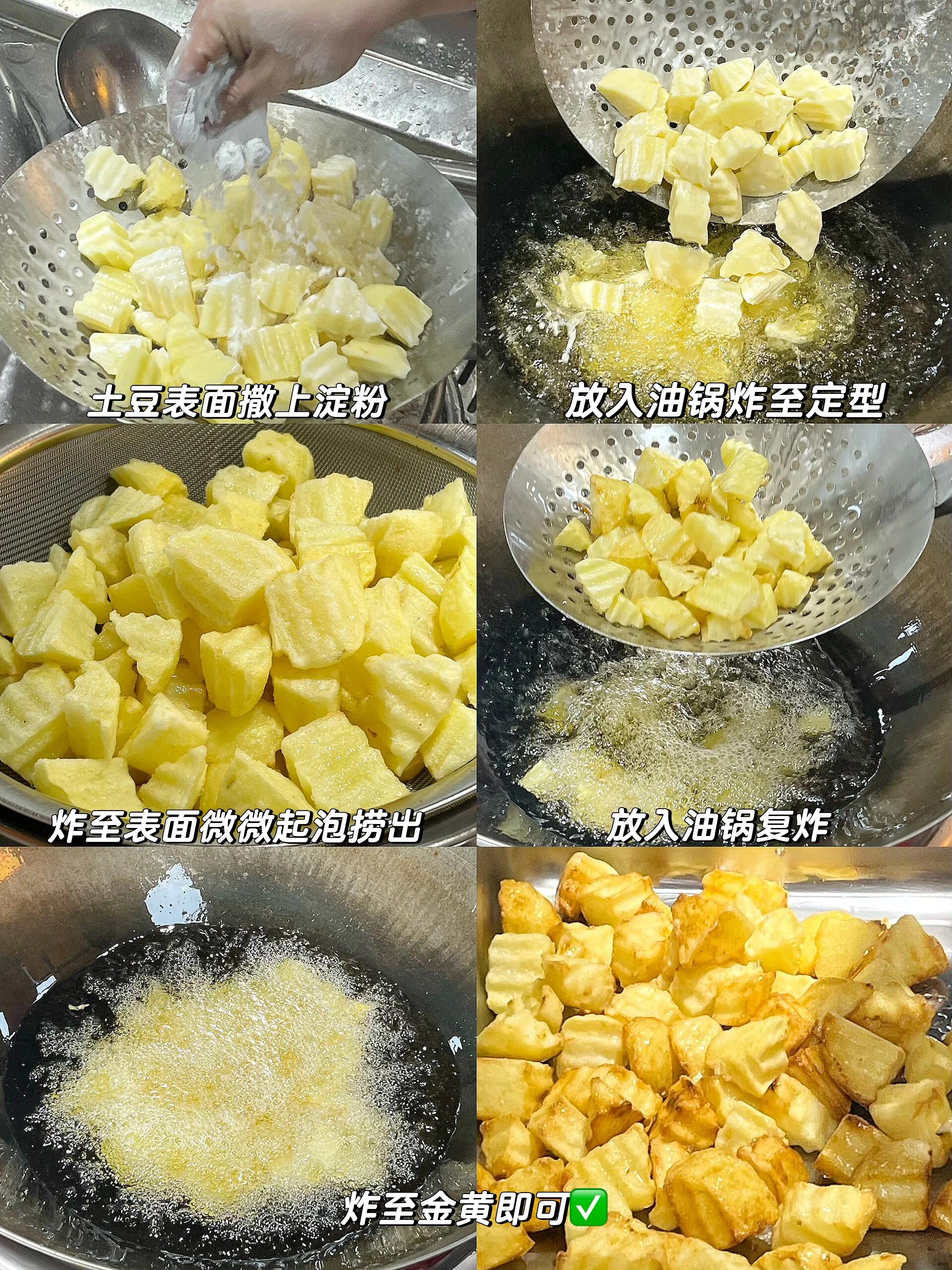 锅里倒油,油量能没过土豆块即可,开中火把油烧到六成热(筷子插进去冒小泡),放入裹好淀粉的土豆块。刚下锅时不要搅动,等土豆定型后用漏勺轻轻推开,防止粘连。保持中火炸3分钟左右,直到土豆表面微微起泡、边缘变黄,捞出控油——这是“初炸”,目的是让土豆熟透。接着把油温升高到八成热(油面冒烟),把初炸过的土豆块倒回锅中复炸1分钟,看到土豆表面变成金黄色、外壳变得硬挺时立即捞出,放在厨房纸上吸去多余油脂。经过复炸的土豆,外壳会像锅巴一样焦脆,放凉了也不会软塌。