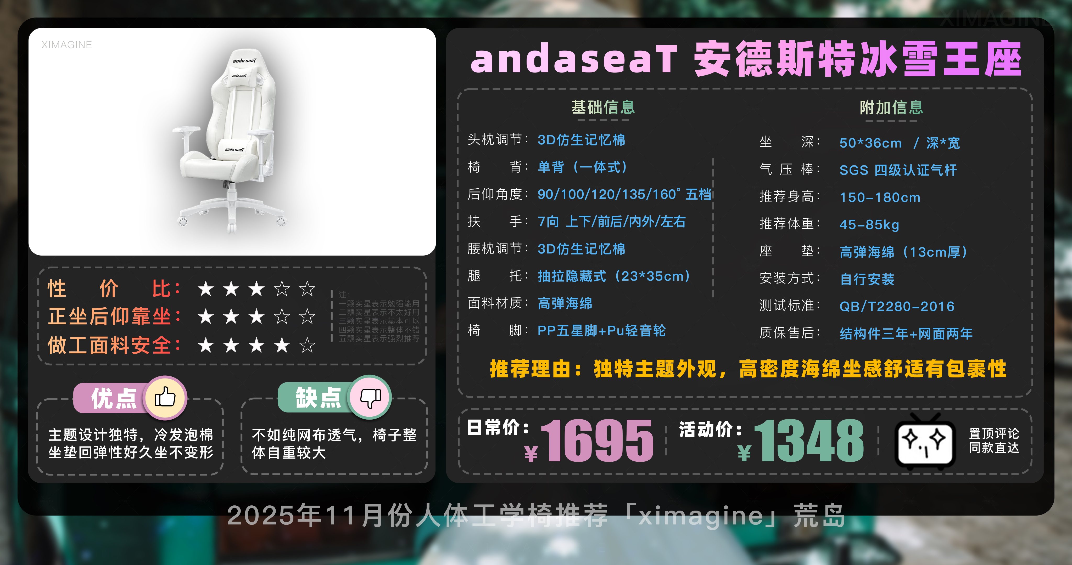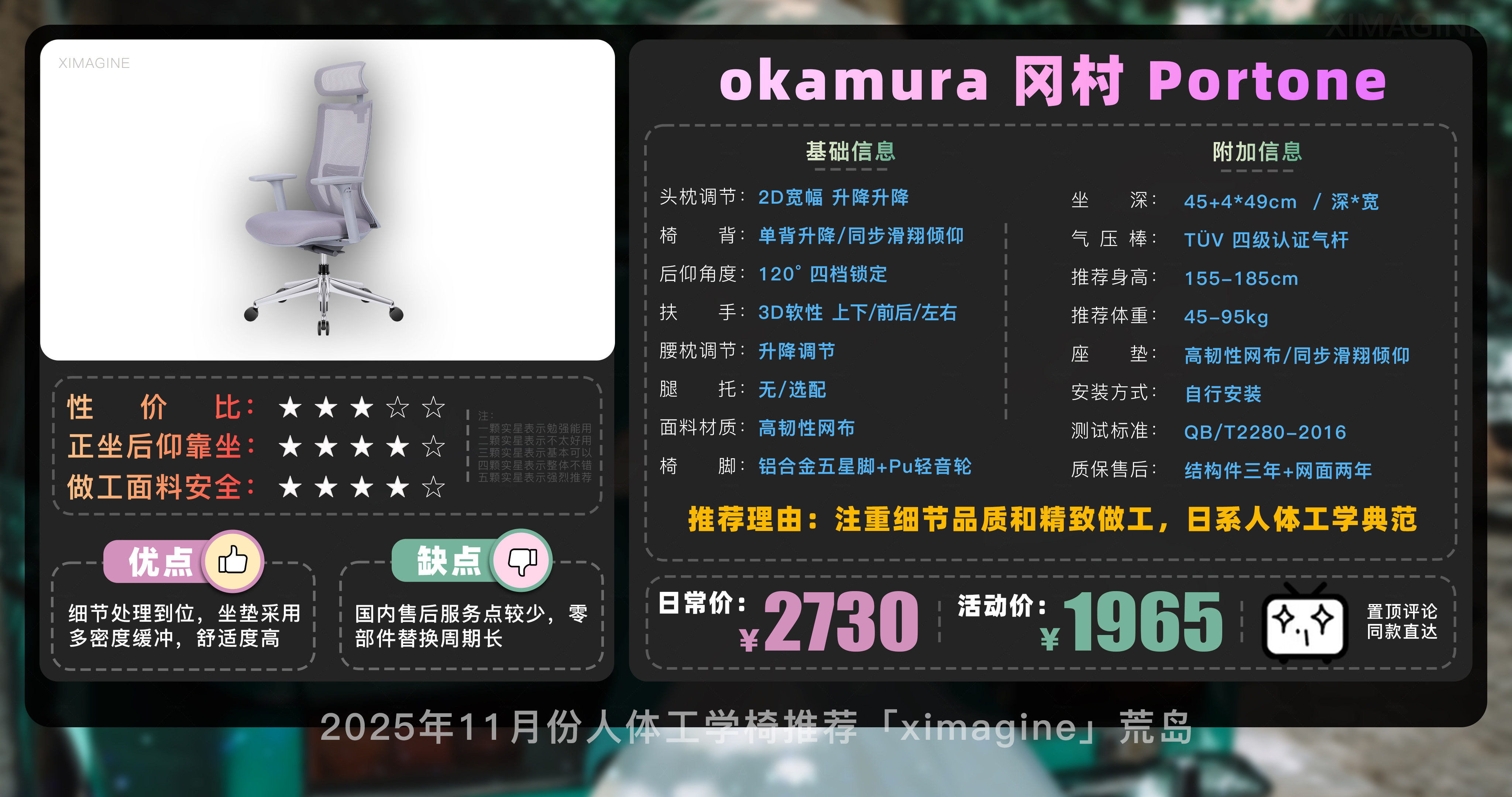 以上就是本期 2025 年 11 月人体工学椅推荐清单,如果有心水的型号,可以戳置顶评论区对应链接拿下!无论是哪一把椅子,它们的目的只有一个,让你摆脱僵硬,重获自由!请记住你的腰椎不是廉价的!每天投入十几小时在电脑前,难道不值得一把能真正支撑你的椅子吗?选一把好椅子,开启你的舒适久坐新纪元吧!本期就到这,如果觉得内容有所帮助,请三连支持!我是「ximagine」,下期再会!
