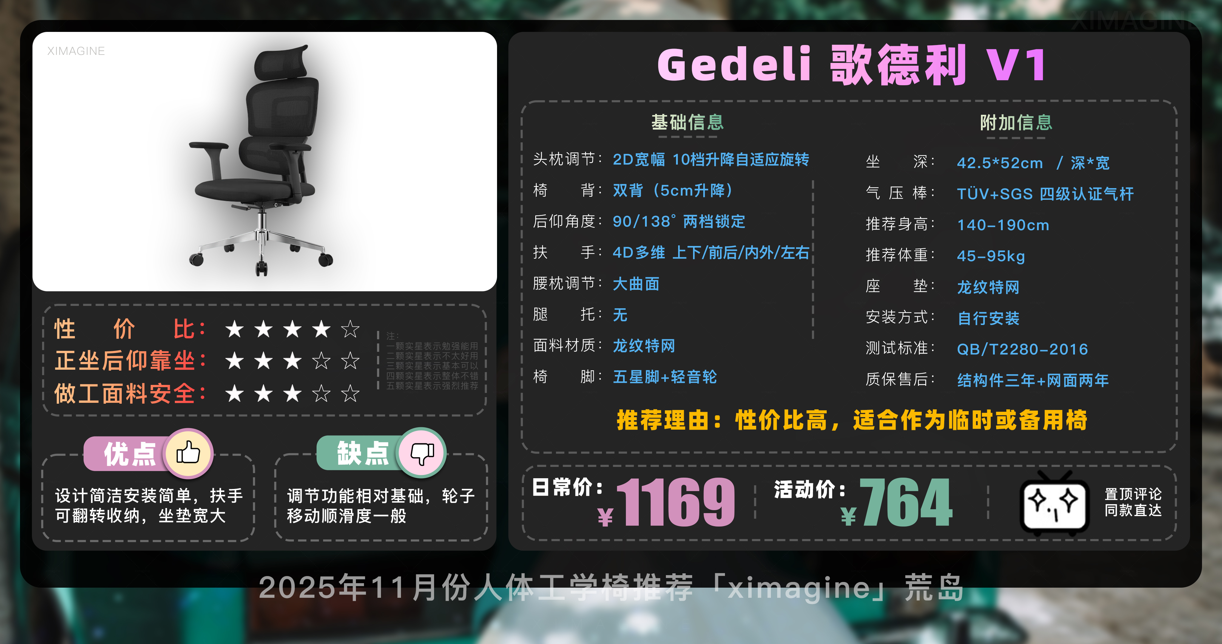 Gedeli 歌德利 V1 给我的感受是简单到极致,它的最大亮点在于扶手可以翻转,这对于居住空间有限的用户来说非常实用,能让椅子轻松塞进书桌下方。坐感方面,它采用了宽大的龙纹特网坐垫设计,让人感觉没有束缚感。用它在小房间里作为备用椅,偶尔进行短时间上网挺好。但是,这款椅子在人体工学支持方面较为基础,后仰锁定功能略显粗糙,高阶的腰部支撑、坐深调节等功能缺失,不适合需要全天候久坐的用户。764 元的它是一款为解决空间问题而生的经济型选择。