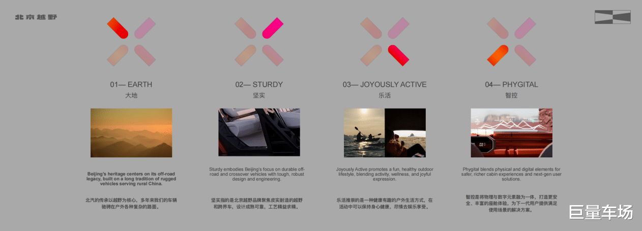 北京越野全新的设计理念命名为“ELEMENTAL”(元素化),建立在四大核心支柱之上,分别是:大地Earth、坚实Sturdy、乐活Joyously Active与智控Phygital。它是一个战略框架,既契合品牌特质,也贴合客户关注的核心——探险、健康与户外生活。从现在起,北京越野将创造性地、持续地将这一理念应用于全系车型。