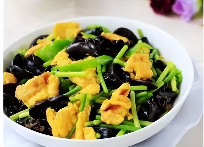 材料:蒜薹,木耳,鸡蛋,盐,葱姜