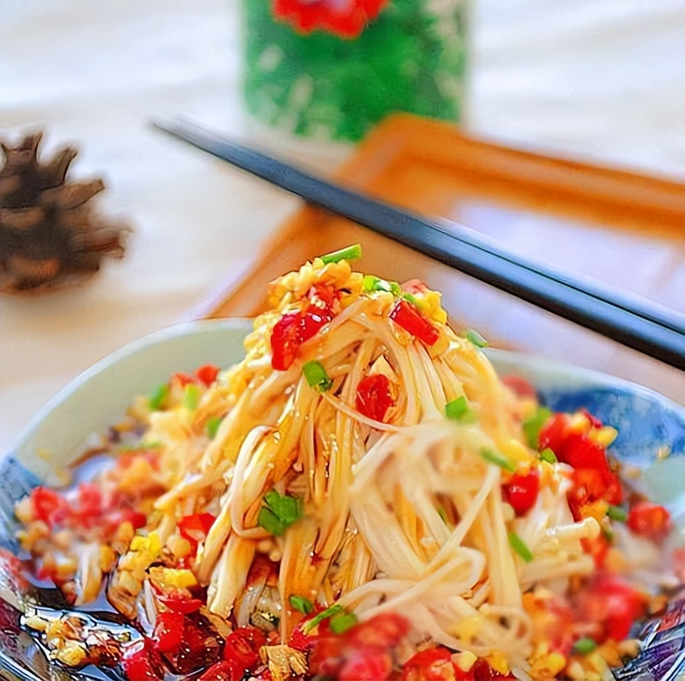 食材:金针菇400克、朝天椒适量、姜2片、蚝油1茶匙、醋2茶匙、酱油1/2茶匙、辣椒油2茶匙、香油1茶匙、食盐1/2茶匙、蒜3瓣、葱1段