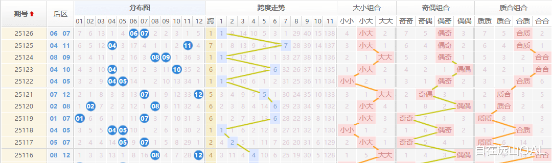 大小组合: 后区“06、07”属于全大组合(以06为界),打破了前期大小交替的节奏。