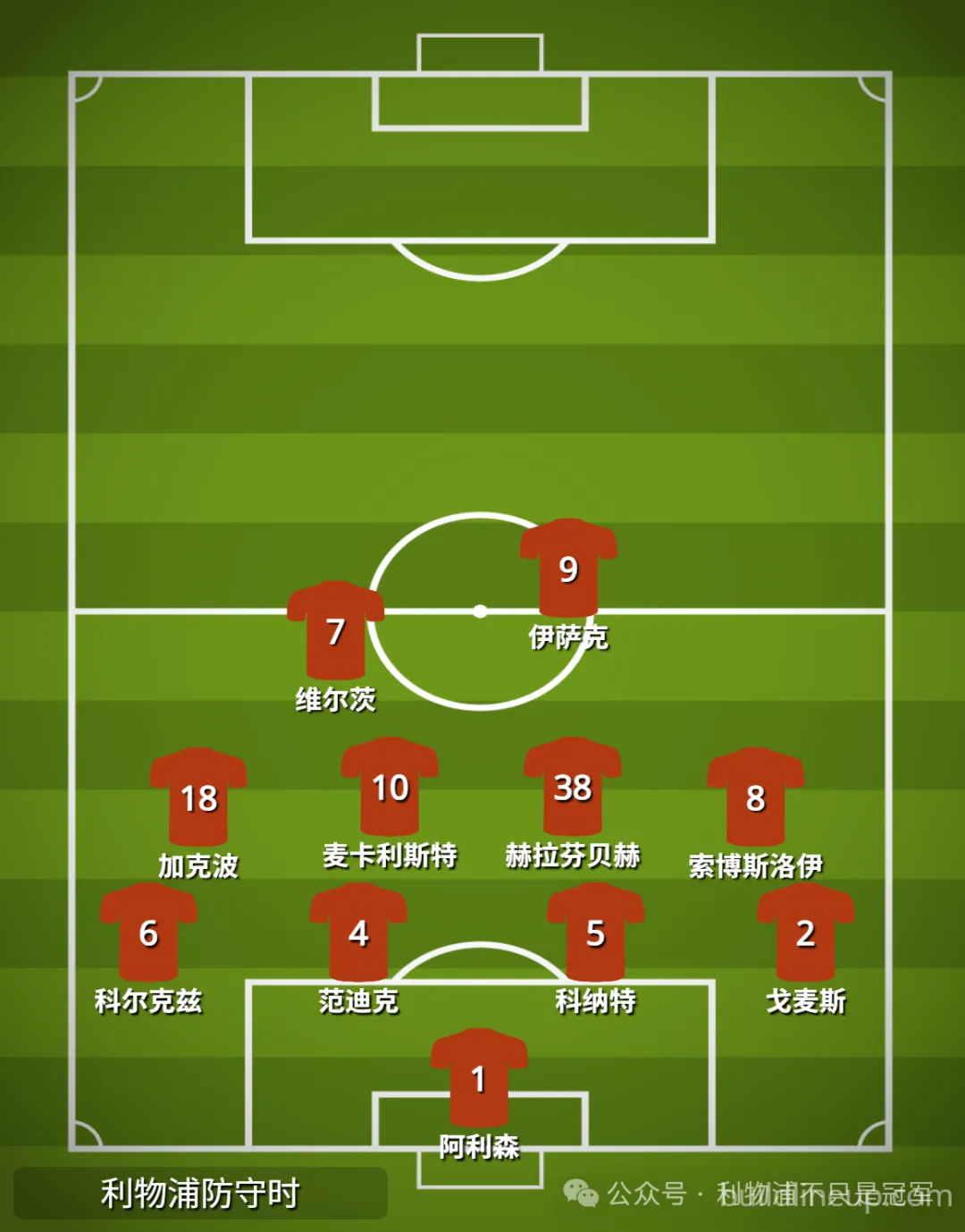 这样利物浦在无球时形成了4名后卫+4名中场的两层防线,前场只留伊萨克顶在锋线、以及维尔茨在他身后不远处游离。