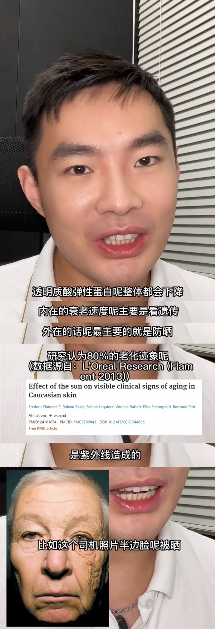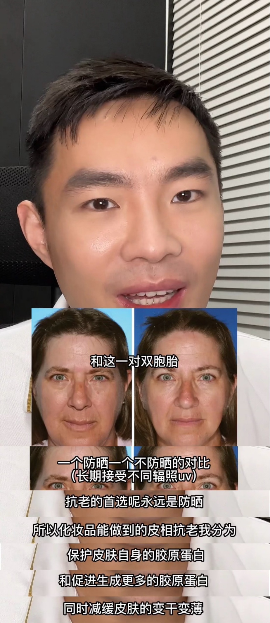 比如这个司机照片半边脸被晒,和这一对双胞胎一个防晒、一个不防晒的对比。胖老的首选永远是防晒。所以化妆品能做到的皮相抗老,我分为保护皮肤自身的胶原蛋白,以及促进生成更多的胶原蛋白,同时减缓皮肤的变干变薄。