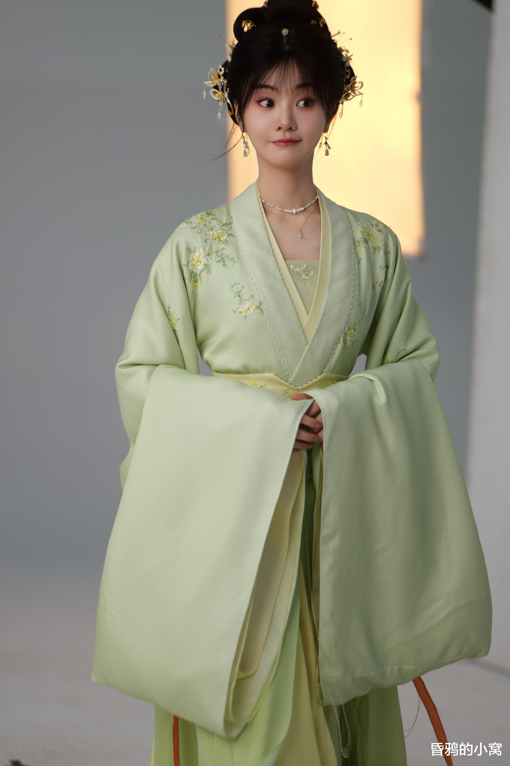 发型以低髻、垂绺、简单簪花为主,不堆砌繁复头饰,修饰脸型轮廓,凸显颈部线条与仪态美感;服饰以米白、浅青、淡粉等浅色系纱质面料为主,裙摆飘逸、水袖轻柔,与胡意旋小巧舒展的身形完美匹配。
