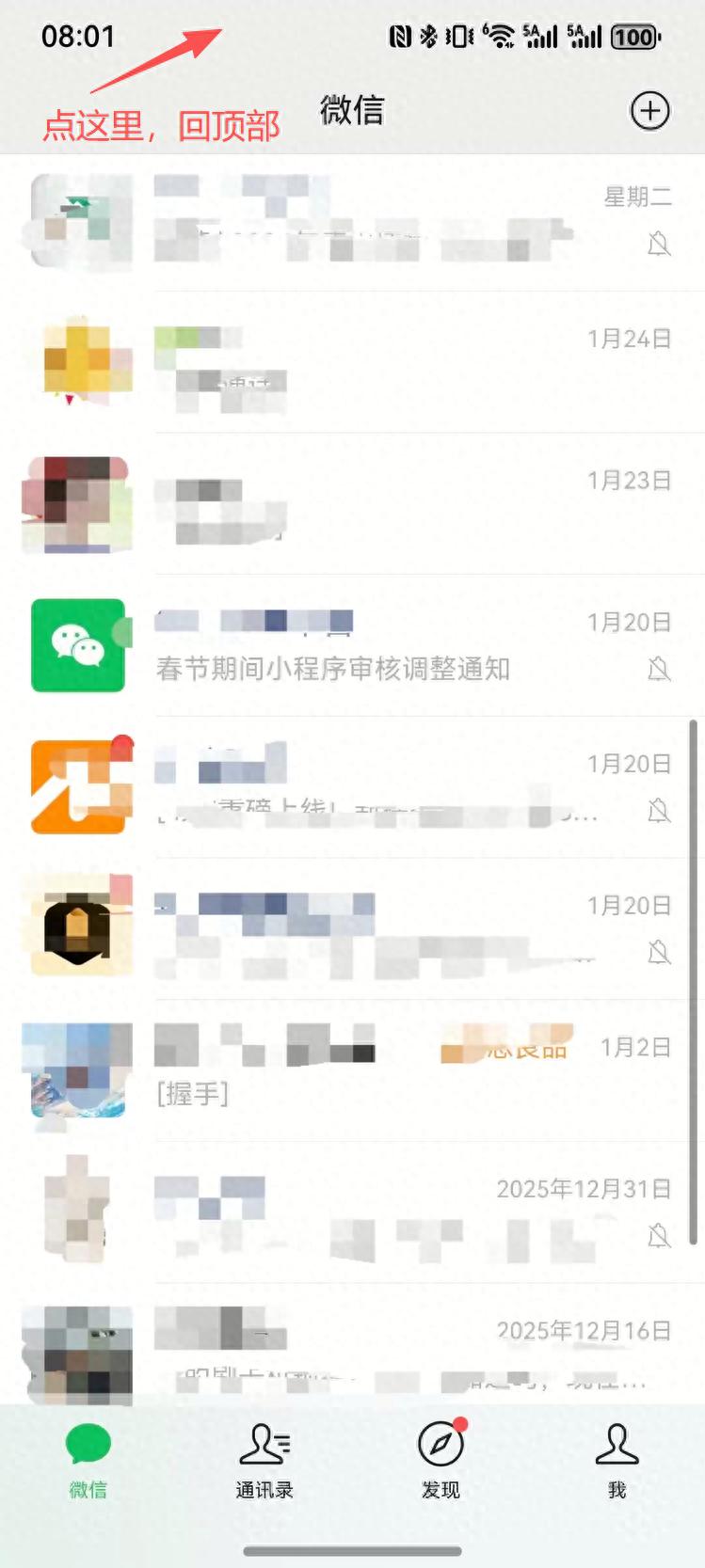 除夕夜,家族群、同学群、工作群消息狂轰滥炸。正和同学聊天,妈妈在客厅里喊“家族群发红包啦”!不用返回列表慢慢上滑找群,记住这招“瞬移术”:手指轻轻单击一下前置摄像头区域,或者微信顶部的状态栏,聊天列表就能快速跳回到最顶部,立刻打开置顶的家族群,抢红包都能快人一步。