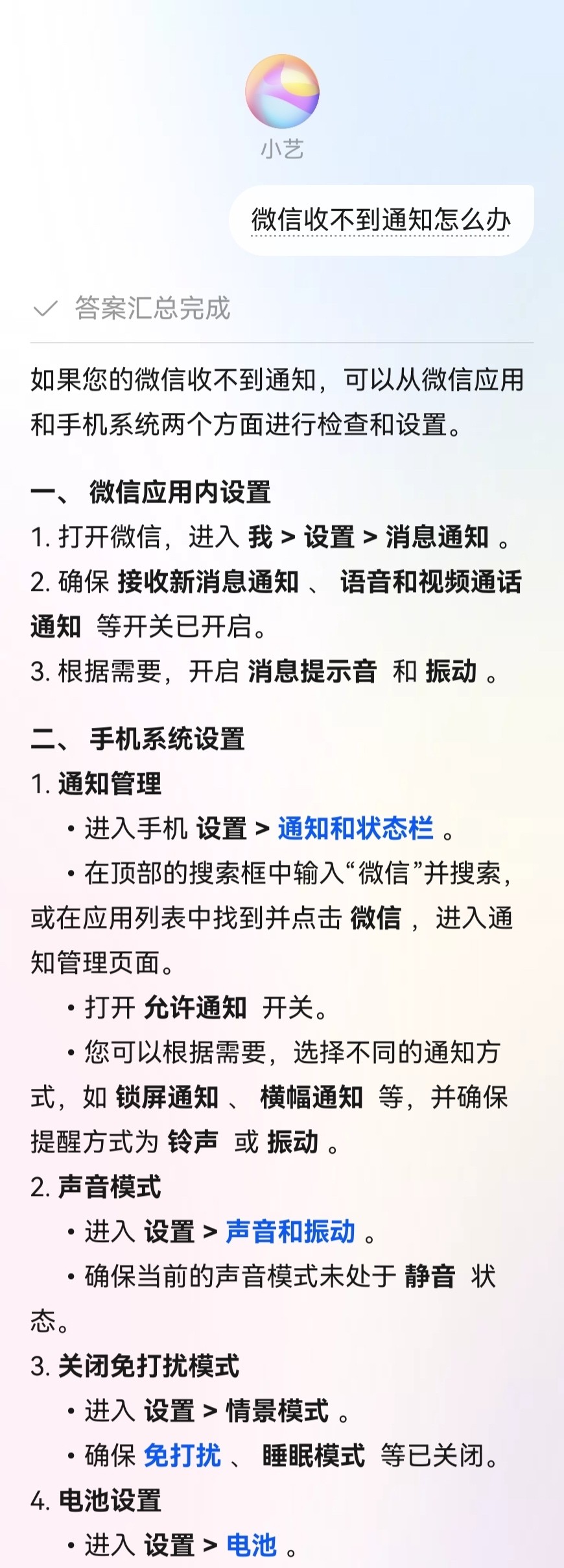 要是遇到微信突然收不到通知的情况,也不用瞎折腾!直接问小艺就行。它会给你一套保姆级教程,什么微信内的设置、电池设置、通知设置等方面的问题,可以依次排查,还能点击蓝色链接直达设置项。