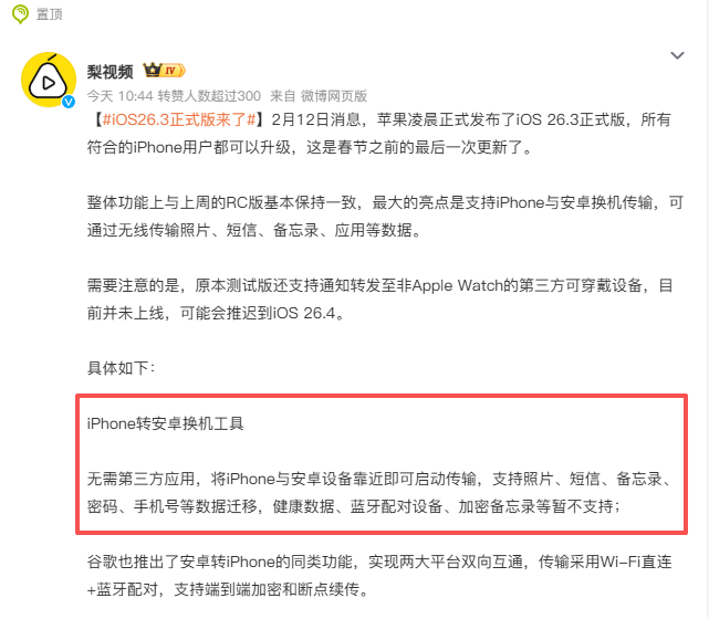 只能说苹果终于想通了啊,在iOS26.3正式版上终于支持跟安卓手机换机传输,通过无线的方式传输照片、短信和应用等等。很多人可能会疑问,哈?苹果现在才支持吗?没错,这都iOS26了,才支持这个功能。