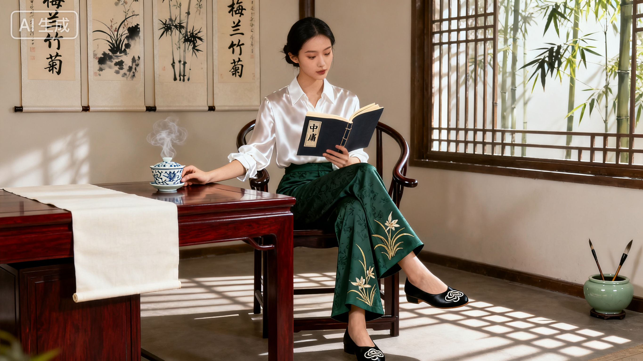 想当干练打工人:穿中式盘扣小脚裤 + 白衬衫 + 小皮鞋,利落又专业,气场拉满,让领导同事都觉得你靠谱!