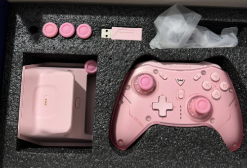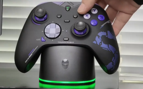 兼容性方面,PC、Switch、Steam都可直连,固件优化后延迟压得很低,高节奏游戏里实际体验稳定性不错。它附带两款D-pad、三套摇杆帽,支持体感,还有180°防滑握柄,耐用性和稳固性都有照顾。通过APP可以调整按键映射、摇杆曲线、死区、体感灵敏度以及宏编程,算是给了玩家非常高的自由度。而RGB磁吸底座既能充电也能收纳,桌面观感也更统一。缺点方面,扳机锁行程略偏长,适合赛车但玩极端快触发的FPS时会觉得略拖;摇杆帽贴合感也有提升空间。续航方面,充满电的情况下可以使用10小时,对于平常喜欢玩游戏的人来说一次性续航时间是完全足够的。