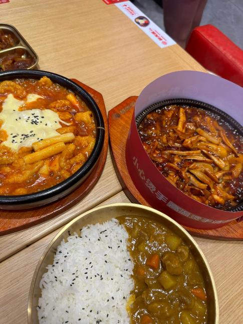 韩式拌饭配料丰富,蔬菜新鲜,溏心蛋流心刚好。酱料咸淡适中,拌开很均匀,不咸不腻。分量够吃饱,店面干净,出餐快,很适合简餐。