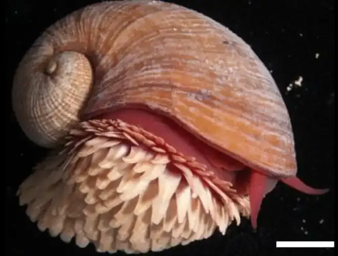 有人肯定好奇,这身铁装备,它得吃多少钙片、喝多少铁水才能长出来?答案能惊掉你下巴——它啥也不用吃,甚至看不起“吃饭”这种低级操作!而且别忘了,它可是咱地球独一份的硅基生物,跟咱碳基生物压根不是一个“生存体系”!咱碳基生物靠吃饭、呼吸氧气活着,饿一顿都难受,可它硅基生物不一样,靠着硅元素撑着身体,再加上体内细菌打工,不用吃饭、不用吸氧,还能扛住剧毒,主打一个“反人类生存逻辑”,说它是外星来的都有人信!它的嘴巴早就成摆设了,消化系统也废得差不多了,所有能量全靠体内的细菌“打工”。它住的热液喷口,喷出来的水全是硫化氢,这玩意儿对绝大多数生物来说都是剧毒,碰一下就凉了,可火山蜗牛偏不,它就爱吸这玩意儿,吸进来给细菌当“口粮”,细菌再把毒物变成能量,喂给它,主打一个“以毒为生”!