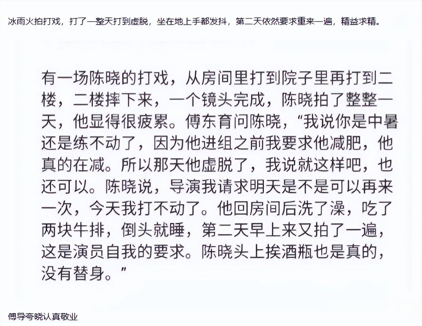 导演和合作演员对陈晓的评价,从另一个角度印证了他的工作态度。《冰雨火》导演傅东育曾记录他拍动作戏拍到体力透支,仍然坚持要求重拍的场景。《理想照耀中国》的导演提到他在受伤情况下依然完成拍摄的细节。这些幕后花絮勾勒出的,是一个对作品质量有着近乎苛刻要求的演员形象。