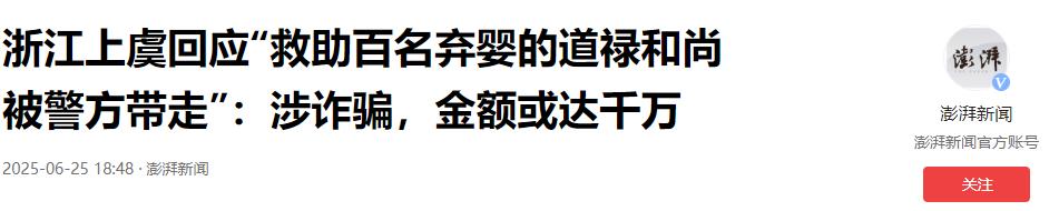 来源:澎湃新闻2025-06-25——浙江上虞回应“救助百名弃婴的道禄和尚被警方带走”:涉诈骗,金额或达千万