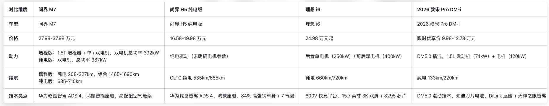 对于用户来说,选车时需结合自身用车场景决策:若有长途需求,优先考虑增程车型;若为年轻用户,预算20万左右,尚界H5是不错的选择;若需要大空间五座车型,理想i6值得关注;若追求性价比,宋Pro DM-i是最优解。