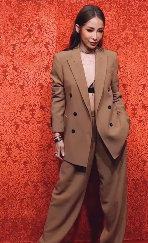 第三张照片,她身穿金“铠甲”,长长的白色披肩,就像是得胜归来的女将军,脖颈上戴着三个项圈,闪闪发光,跟“铠甲”上的闪光服饰相辉映,整个人大方帅气。