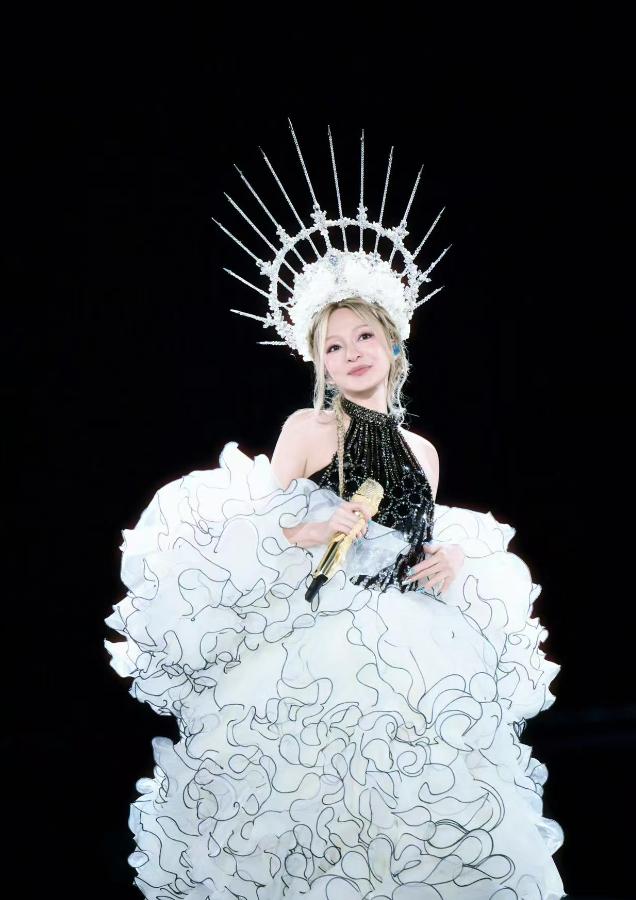 11月23号张韶涵在社交账号分享了一组演唱会照片,照片中她戴着钻石王冠,雪白的花朵簇拥着,王冠如同太阳一般发出光芒,她上身穿黑色露肩礼服,
