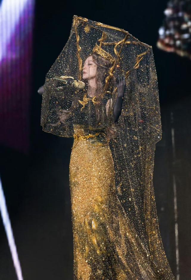 第二张图片则是一身黑金细沙连衣裙,肩膀加王冠的造型更是惊艳,金色的王冠由四条金蛇蜿蜒而上,