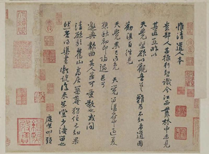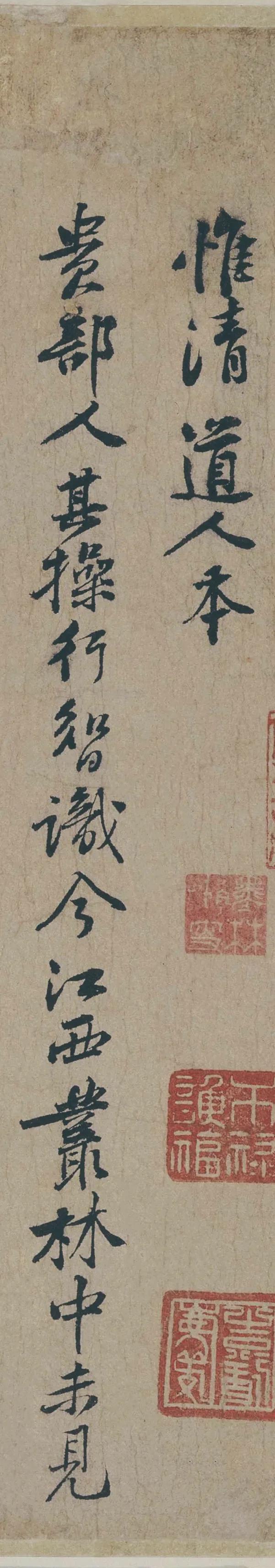 《惟清道人帖》之内容,为黄庭坚致友人之信函,主要论及一位名为惟清之道人。惟清俗家姓陈,系江西隆兴府黄龙寺之禅师,于政和七年(1117 年)圆寂。黄庭坚于信中对惟清之操守与智慧赞誉有加,称其在江西佛教界堪称翘楚,无人可与之比肩。信中还记述了时任官员张商英(字天觉)欲以“观音”之名征召惟清,而惟清婉言谢绝,后经黄庭坚从中劝说,惟清亲往面见张商英,此事方得以妥善化解之过程。此寥寥数语,生动勾勒出北宋士大夫与僧侣之间紧密且复杂之交往网络,深刻反映出当时之文化生态。
