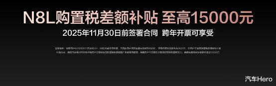 为回馈广大用户的支持与信赖,腾势N8L特别推出限时购车权益,权益价值至高10.67万元!包括价值1.7万元的三年免息,最高1万元的置换补贴。此外,不必担心因为交车晚,享受不到购置税补贴:在2025年11月30日24点前完成合同签署的用户,如果因非用户原因车辆未及时交付,导致开票实际发生在2026年,可享受购置税差额补贴,最高1.5万元!