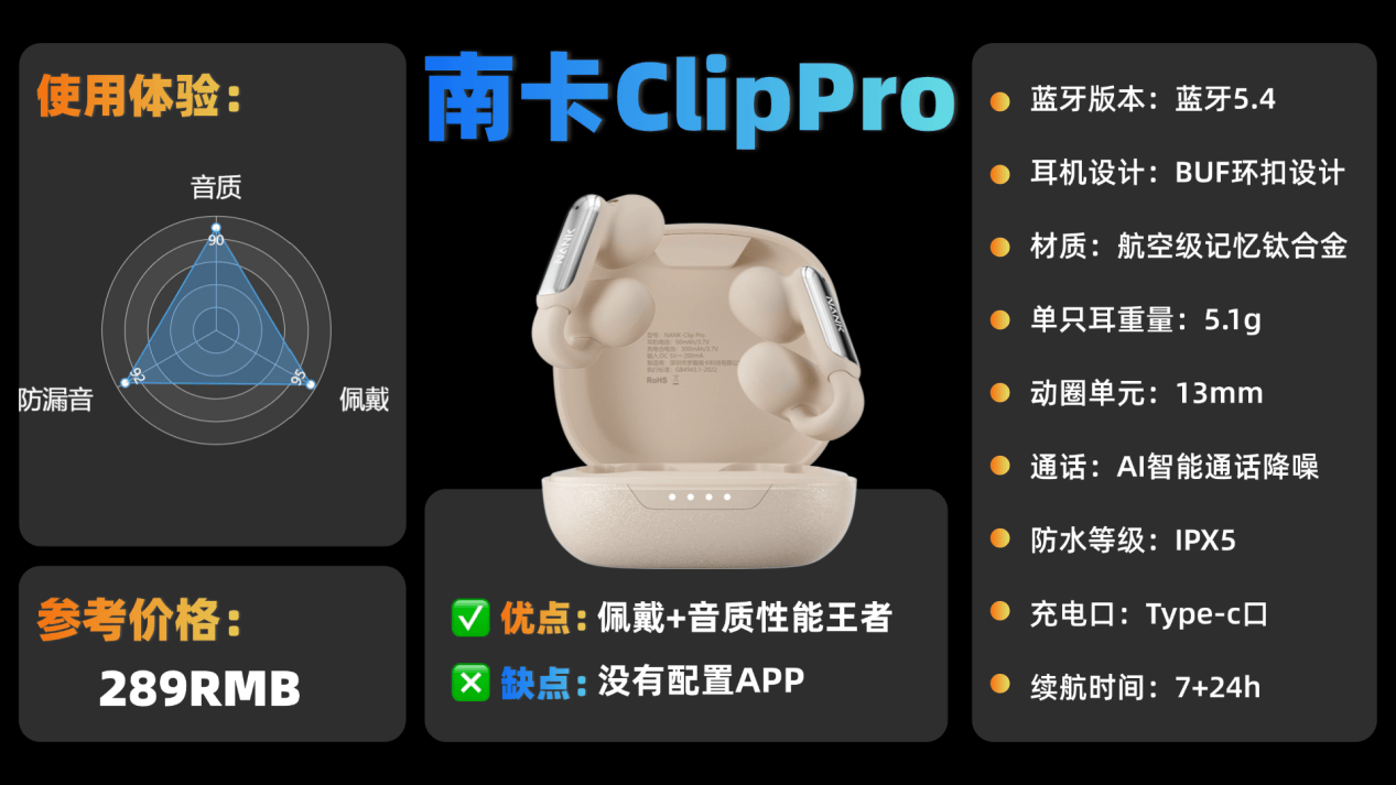 预算两百左右,对舒适度、音质要求高的朋友,强烈建议选择南卡clippro!这款耳机是我实测过的五百内价位开放式耳机中体验非常出色的一款!是我去年一整年使用频率最高的一款开放式耳机。非常牛的是,它两百多的价格音质配置直接拉满,完全能够跟市面上千元级开放式耳机相媲美!