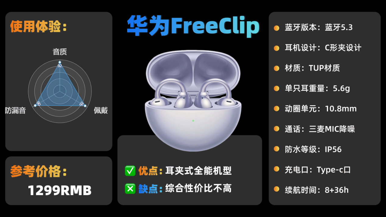 如果你的预算在千元以上,且是华为生态系统,那我建议你一定要试试华为FreeClip!如果你的预算在千元以上,那么这款是我的首推!华为FreeClip耳机的外观设计很有质感,采用磨砂烤漆工艺,在阳光下会有金属光泽,低调又有高级感。整体造型融合了时尚和科技感,受到了不少年轻用户的喜爱。