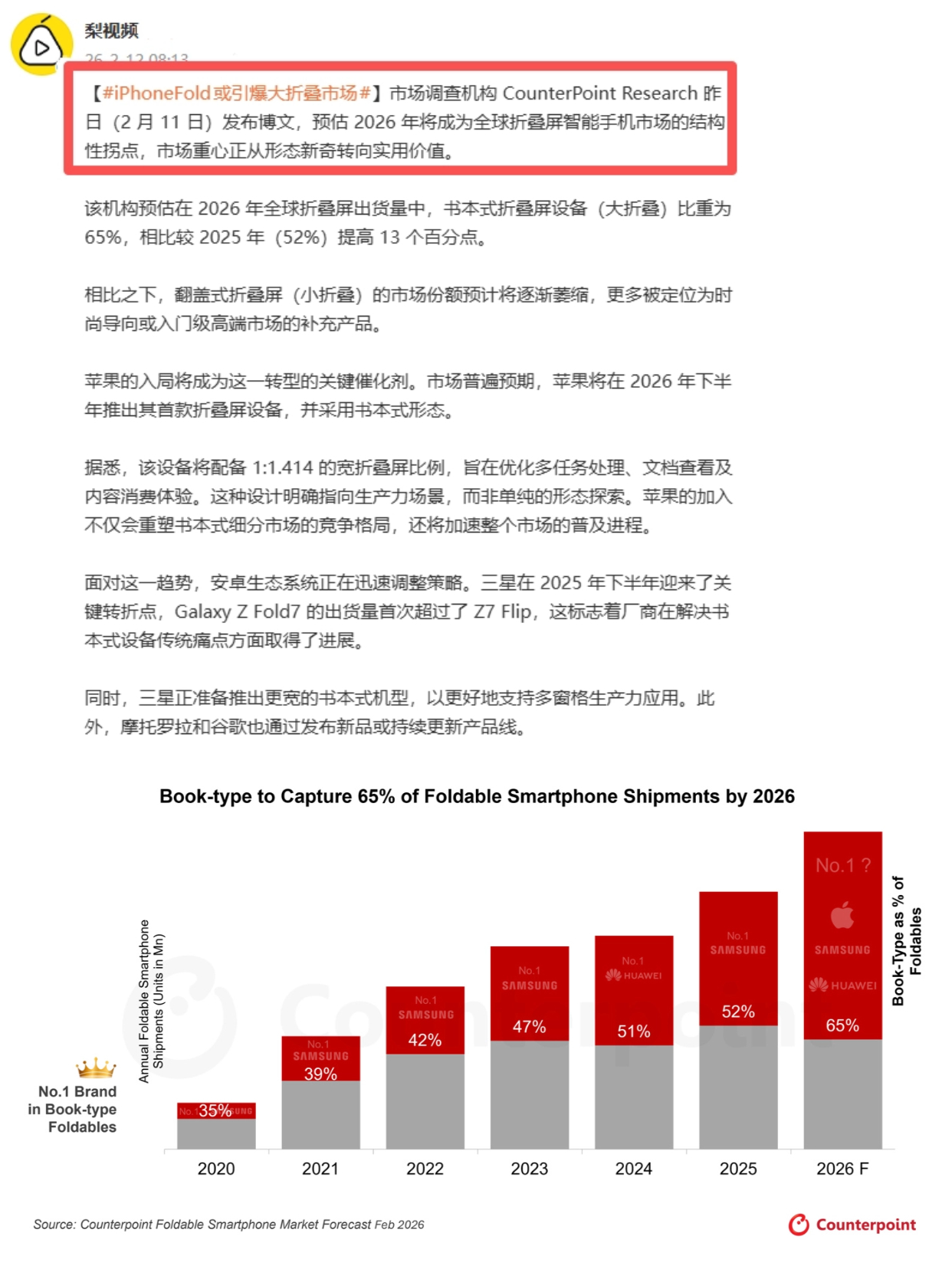 最近有机构研究,苹果首款折叠屏iPhone Fold或引爆折叠屏市场。虽说苹果的品牌影响力摆在这,加上软硬件深度整合的产品力,还有“无折痕”这下一代折叠屏的产品特性,难不成又要颠覆一个行业?