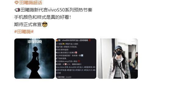 另外,日前,有网友在 #田曦薇超话# 的话题下发布了疑似vivo S50系列代言人的预热海报,并称,“田曦薇新代言vivoS50系列预热节奏 手机颜色和样式是真的好看!期待正式官宣”。不过对此爆料, @vivo 官方和 @vivo韩伯啸都未给出回应,@田曦薇 的个人微博也同样没有相关回应,目前看只有等官方预热了。