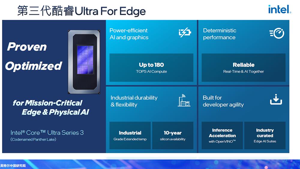 与消费级、商用级酷睿的侧重点不同,它强调工业级要求,例如温宽、耐用性、10年可靠性,同时增强了机器人及工业领域要求的高实时性、高确定性。