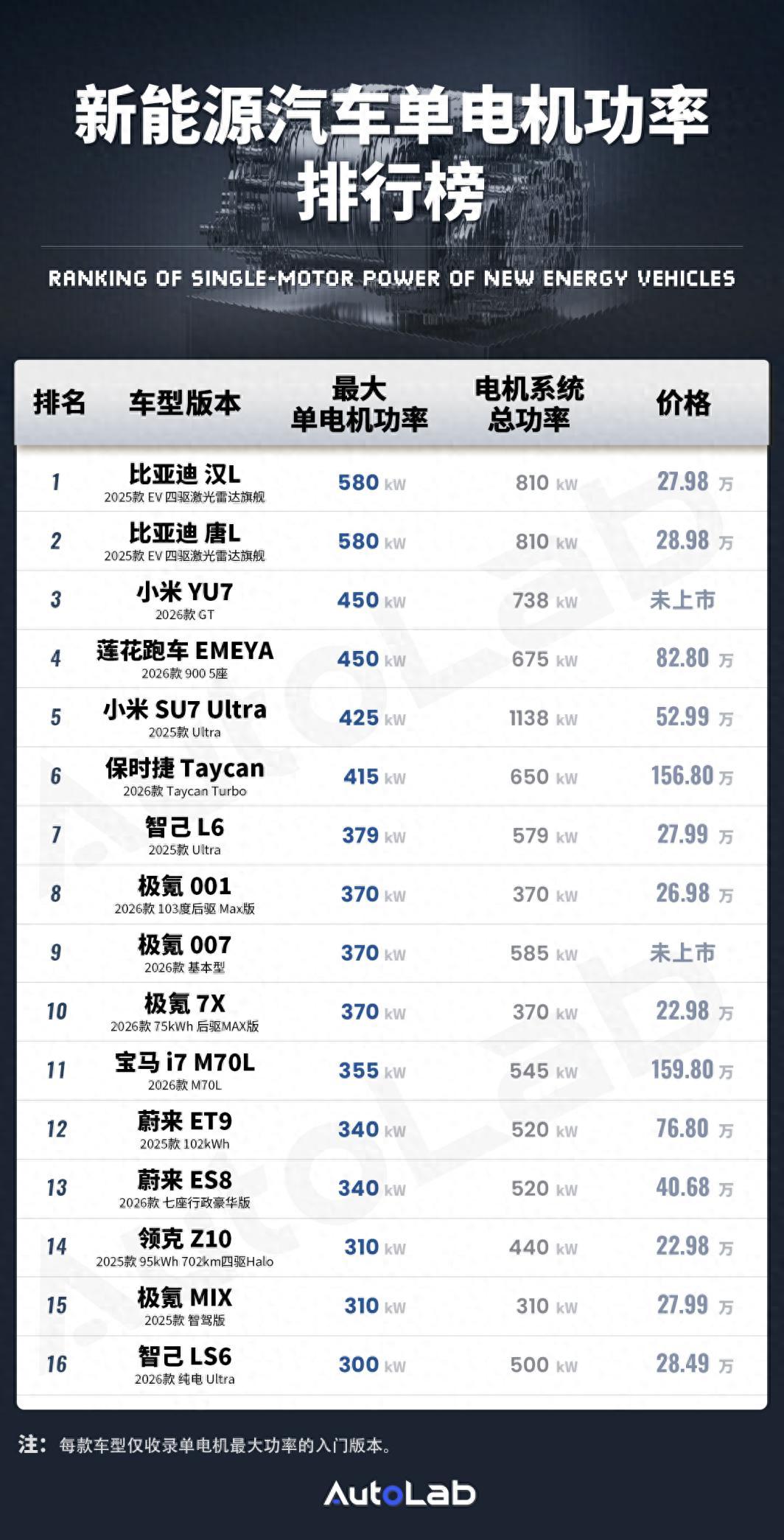 从这份榜单也能看出,单电机300kW的性能表现,在如今的新能源市场已经排不进前十了。