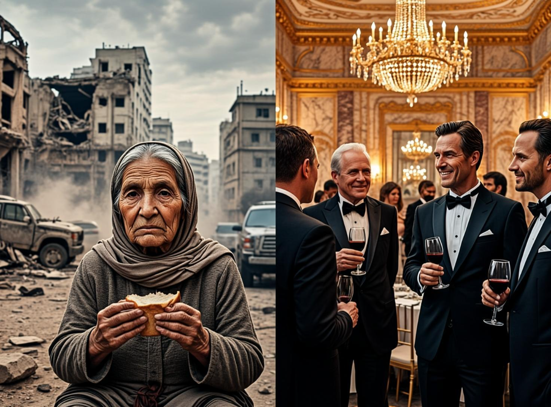 德黑兰的街头,一位老妇人在废墟旁为一块面包哭泣,干瘪的泪水混杂着漫天的尘土;纽约的豪华宴会厅里,西装革履的精英举着红酒杯,脸上挂着胜利者的微笑,轻描淡写地谈论着远方的崩溃。