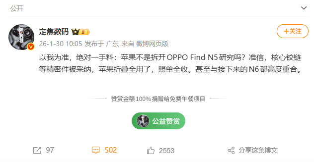 而主打的无折痕体验更是有意思了,之前就有媒体爆料说过,苹果购买了很多OPPO Find N5回去研究其折痕,尝试很多次都很难做到跟Find N5一样的折痕效果。而目前也是有信息表示iPhone折叠屏也是用了OPPO折叠的供应链,然后呢OPPO将在今年发布的OPPO Find N6(将会采用黑绷带玻璃)也将会在年后的时期到来,有博主还表示其无折痕的体验将会独占半年,这就意味着,Find N6将会早于iPhone折叠跟大家见面,同时折痕体验应该都是同一维度的,那么对于因为折痕还不想入手折叠屏的用户就可以提前入手了。