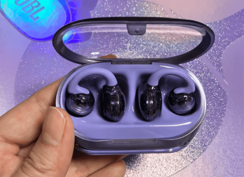 JBL琉璃扣的充电盒采用半透明设计,内部结构清晰可见,整体视觉风格偏未来感,精致度很高。佩戴方面,单耳重量约6.5g,采用C形弹性桥结构,发声单元与固定单元外层均包裹柔性TPU材质,佩戴稳定性不错。不过由于整体重量略大,长时间佩戴后夹耳感会逐渐明显,舒适度表现属于中等水平。