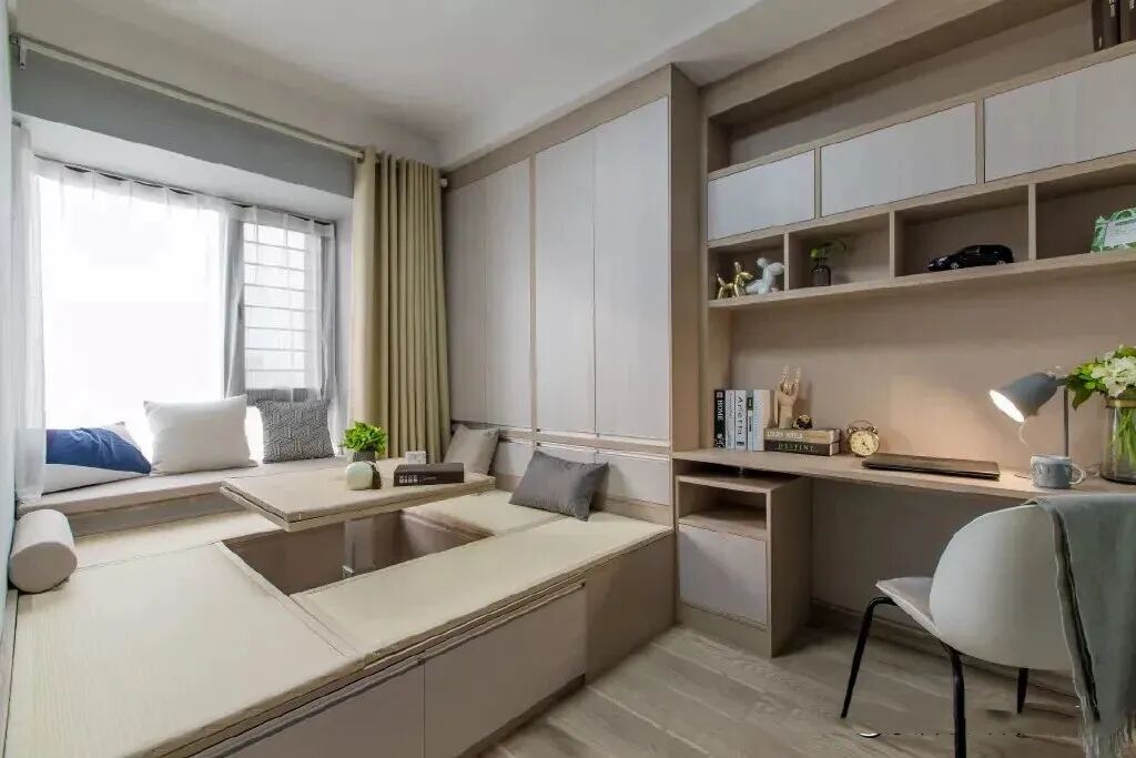 榻榻米书房,榻榻米床不仅只是用来休息,更是可以用来作为办公桌,或者棋牌间,几个朋友在一起打牌聊天非常的实用。整个定制的床以及办公桌的设计,简约又大气,实用为主。