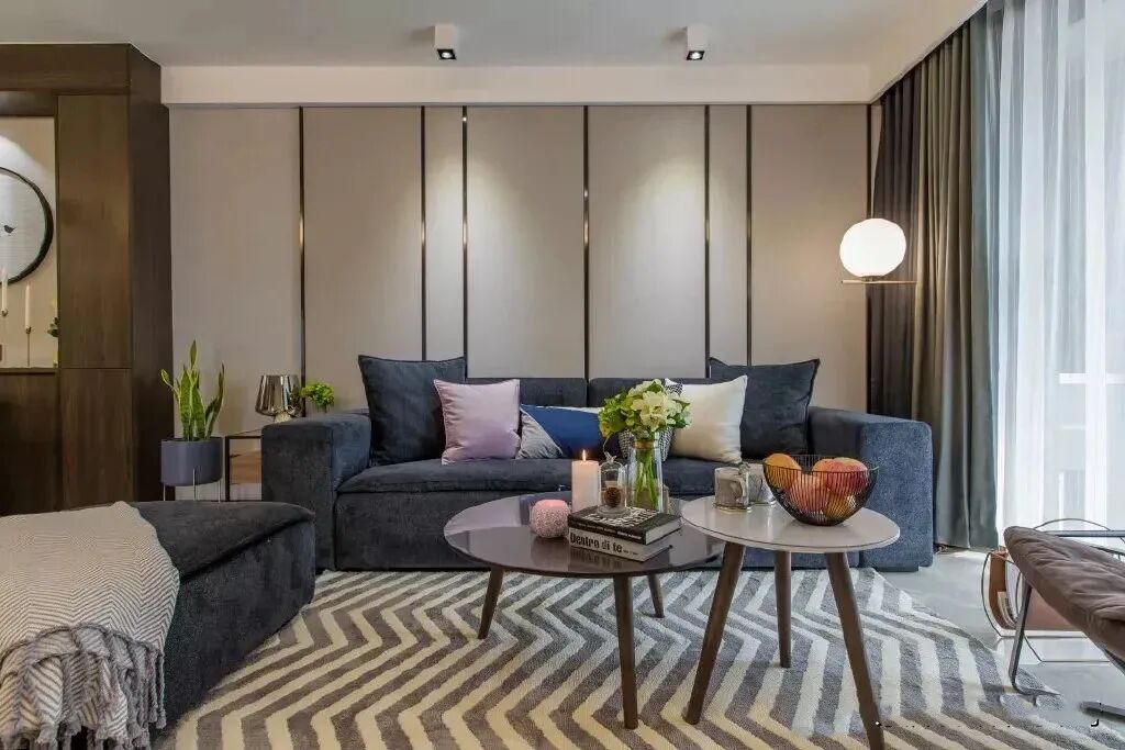 客厅,现代风格的设计更为优雅大气,沙发背景墙做了壁纸的装饰,用了金属条做了简单的装饰,深灰色的沙发搭配简约的茶几,以及周围的装饰品做了简单的装饰,整个客厅的轻奢感很强。