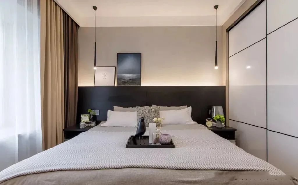 床头的背景墙做了分层的设计,床头的背景板后方隐藏灯带,再放上装饰画作为背景装饰,整体更加的好看和大气。室内的采光非常好,而且装饰上倾向现代风,让人感觉时尚又温馨。
