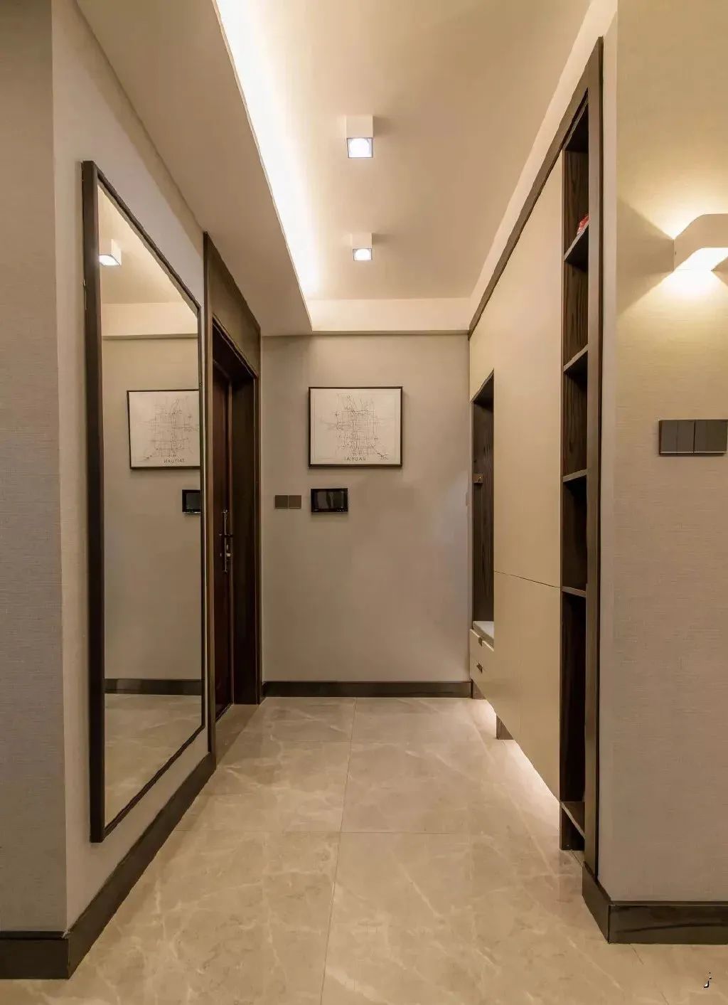 入户进来的玄关空间宽敞,定制的衣柜实用为主,不仅有收纳柜,还有展示柜,还有玄关换鞋凳的设计,底部的空间做了灯饰,进门后不需要开灯也可以看到路,晚上回来也方便,托换鞋子。地面用的是瓷砖装饰,大气漂亮。
