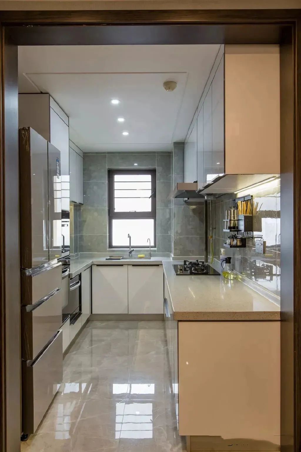 厨房做的是半开放式的设计,整个厨房贴了灰色的瓷砖看起来更为高档,而且定制的是U型的橱柜设计, 整个空间显得更加的宽敞,再加上厨房内部的采光非常好,在瓷砖和亮光门柜的反射下,整个空间更为宽敞明亮。