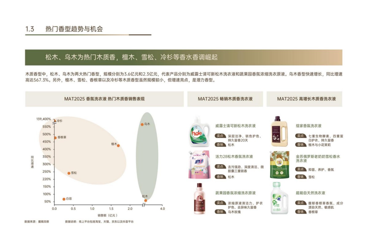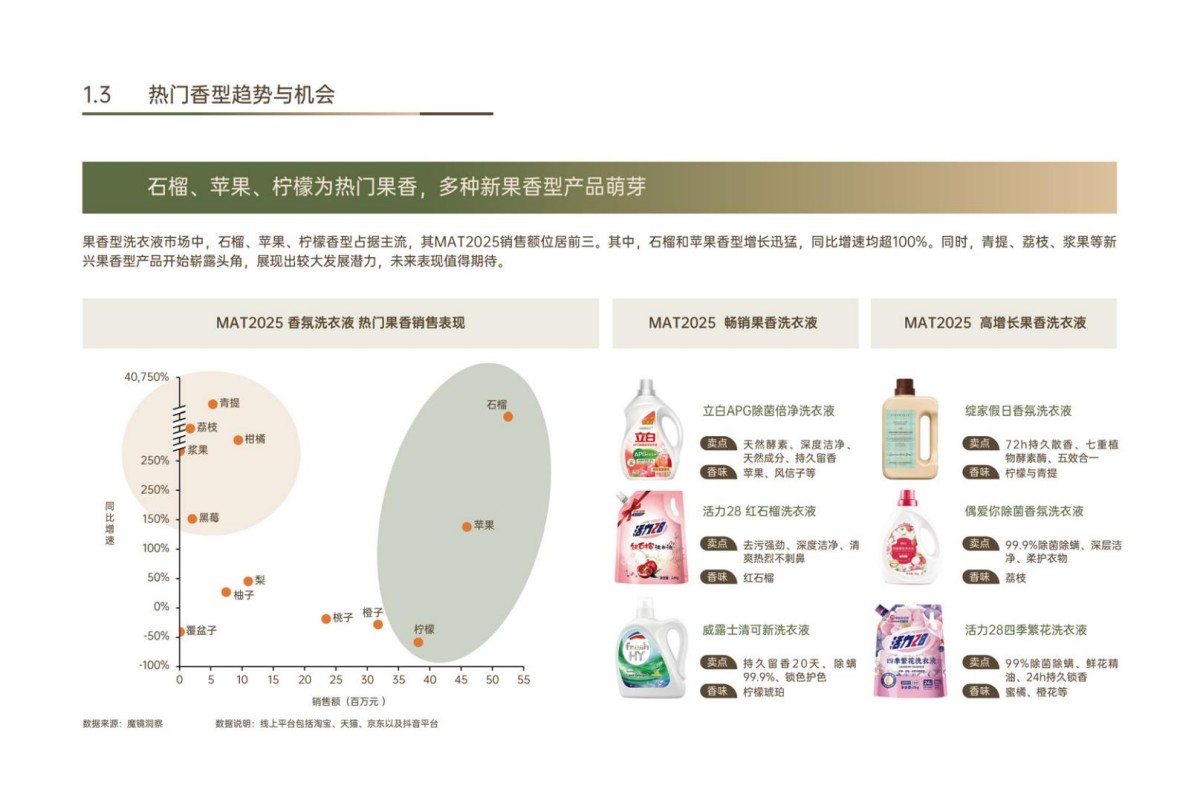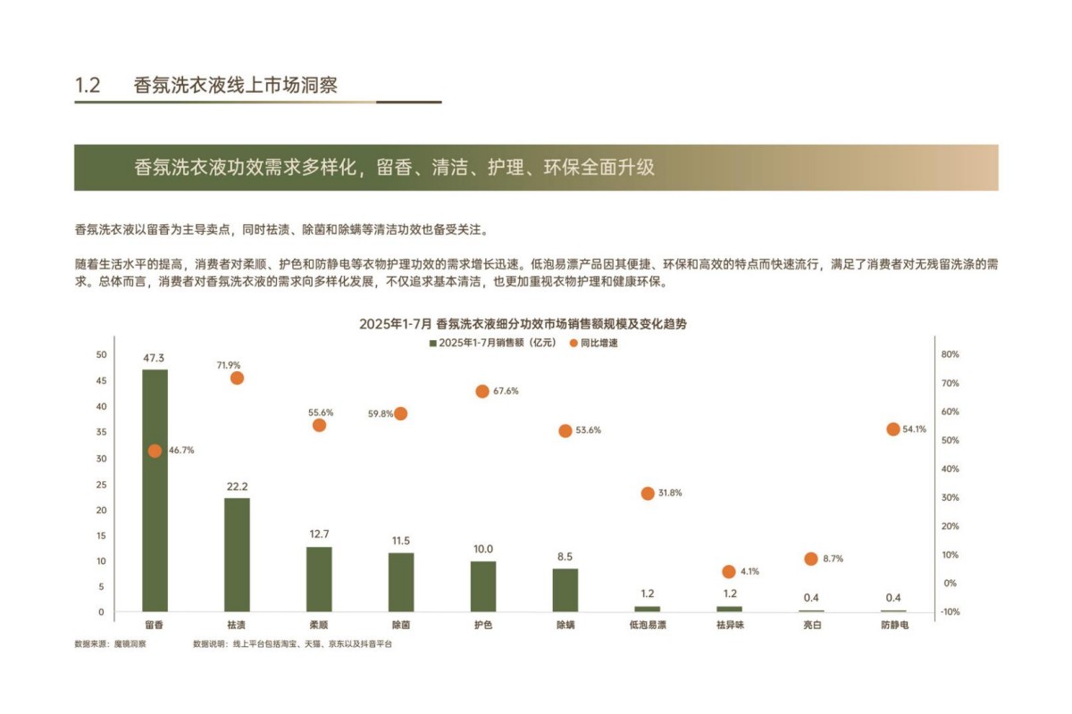 当洗衣从 “去污刚需” 变成 “嗅觉享受”,香氛早已不是洗衣液的附加功能,而是治愈情绪、表达风格的核心载体。2025年中国织物洗护香氛市场持续爆发,线上香氛洗衣液销售额同比增长 44.9%,占据洗衣液市场 44%份额,一场关于 “香味” 的消费革命正在上演。