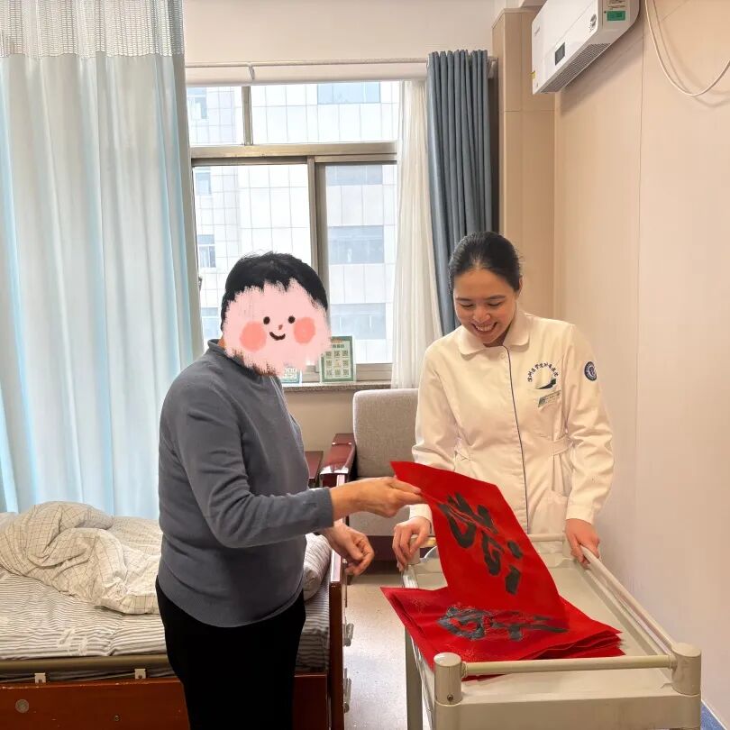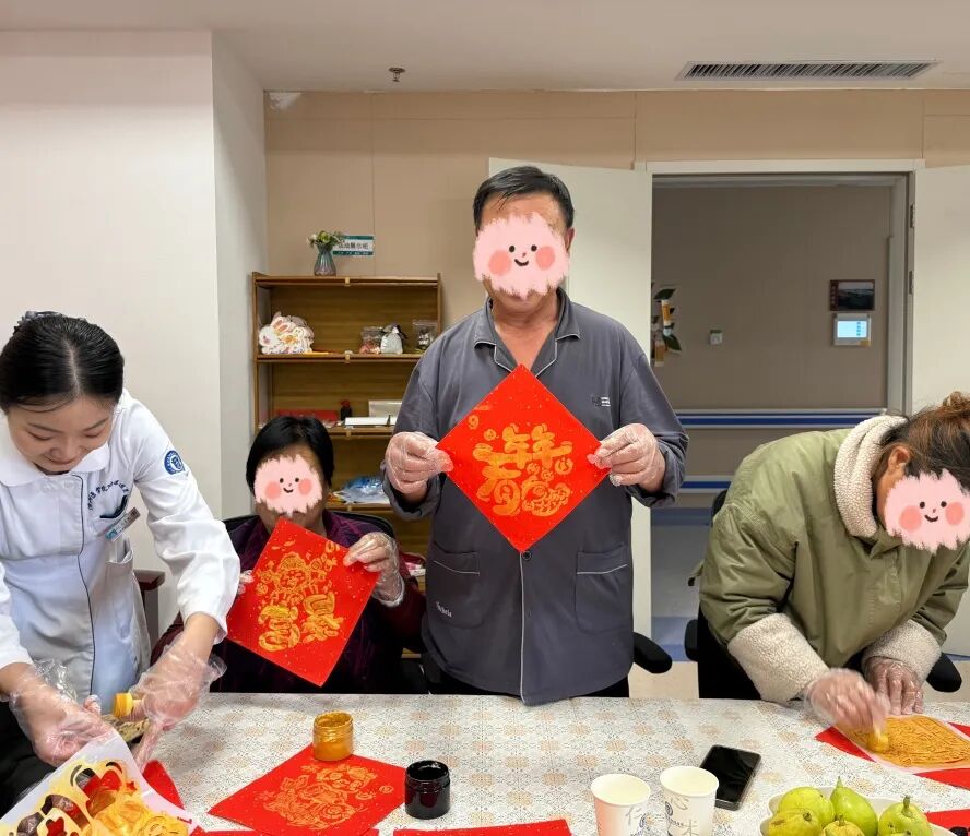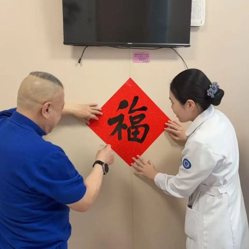 活动临近尾声,患者们亲自提笔书写福字,并将这些寓意平安吉祥的福字张贴在病房门窗、床头及走廊墙面上。一笔一划寄托祝愿,一贴一挂尽显年意。红彤彤的福字既点缀着温馨的病房,也承载着对每位患者安康顺遂的美好祈愿。