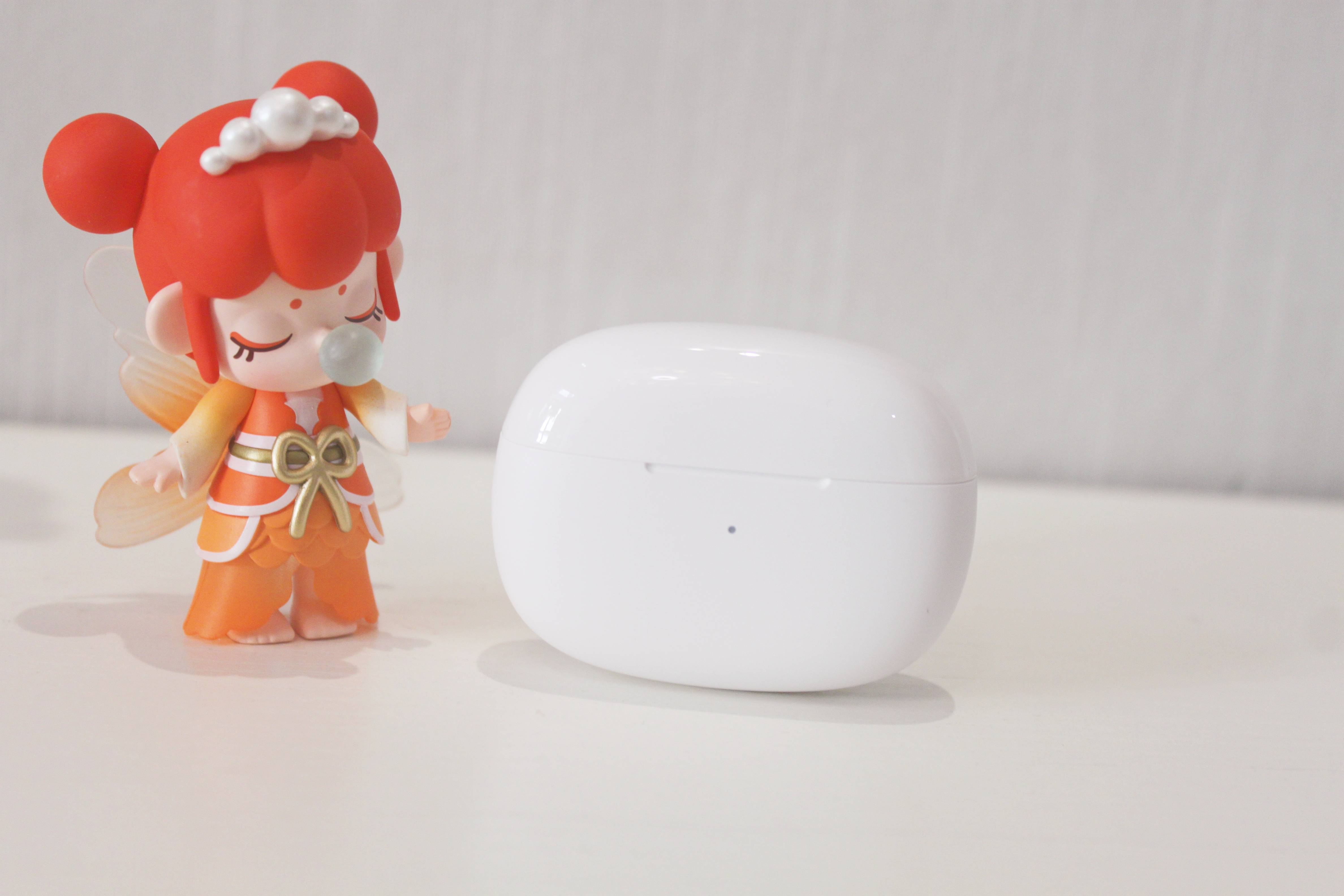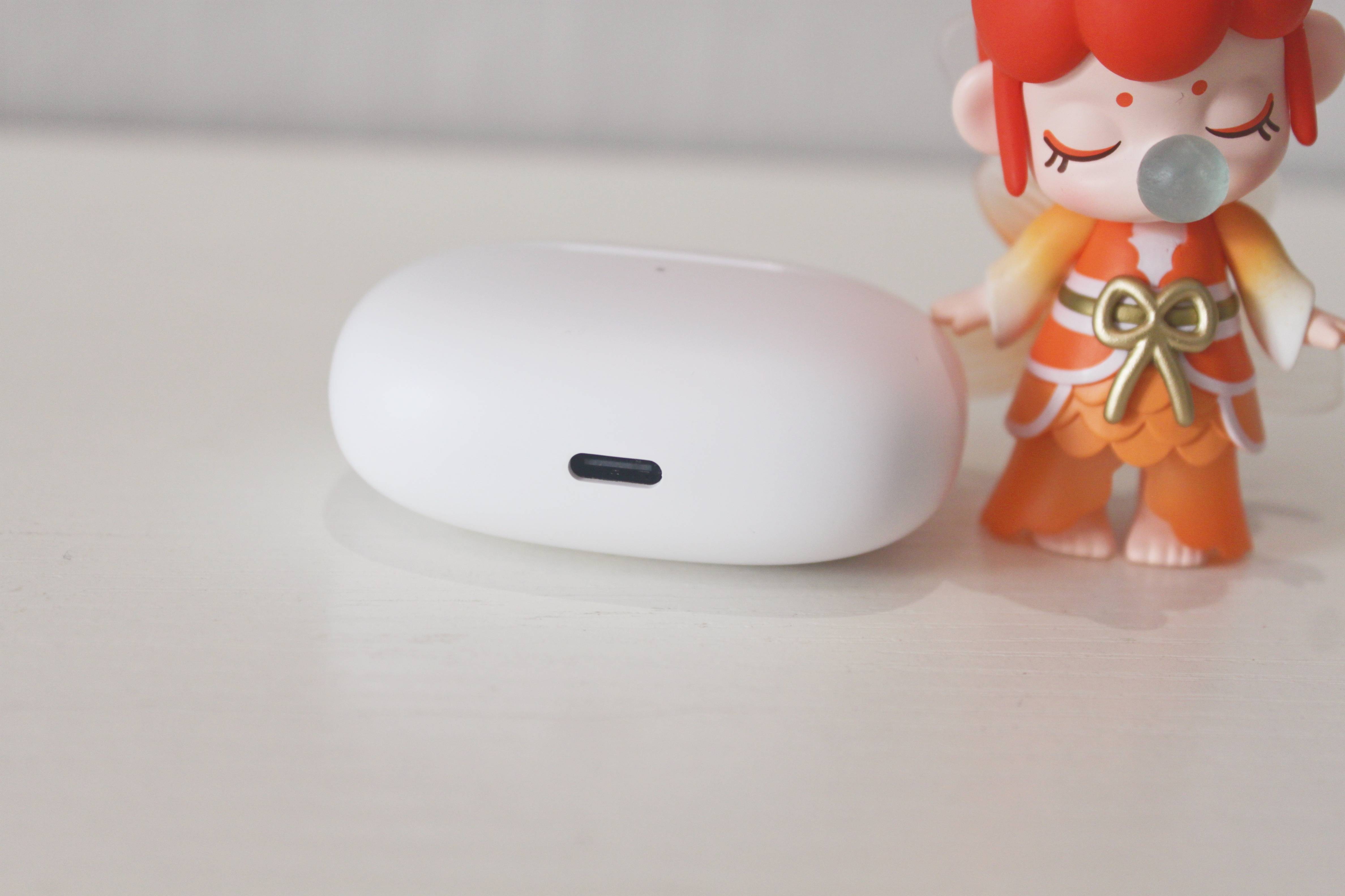 耳机的充电仓采用了陶瓷白的配色,加上四周倒角的设计,让整个充电仓有个不错的颜值,看起来也更加圆润,在握持时也能有一个不错的手感。